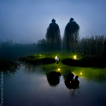 Ghostly monks standing by a pond.