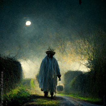 Further Comments: Walking the area in silence, this phantom is described as dressed in a long open jacket with many small buttons, a waistcoat, tie, short trousers with matching stockings and a top hat.
