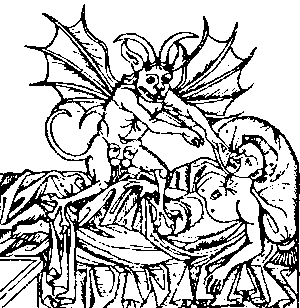 An old woodcut of a demonic figure standing over a bed.