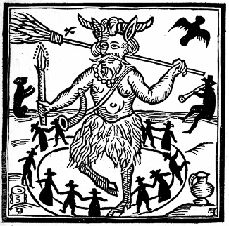 An old woodcut of the Devil dancing close to a magic circle and shadowy figures.