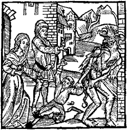 An old woodcut of the Devil dragging a person through the street of an unknown city.