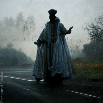 Further Comments: Driving their mule drawn cart on a cold October morning, two women stopped along the road when a strange woman crossed the road ahead of them. Despite the freezing temperature, the lady wore a pink summer dress with a white lace headscarf. The two women in the cart then realised that the pedestrian was floating around thirty centimetres from the ground, and that the figure had skin and eyes like grey dust. One of the women fainted, and their mule bolted, not stopping until two miles separated it from the entity.