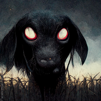 Further Comments: This demonic dog is the size of a small bear, with yellow eyes as large as saucers. To stare the beast in one of these eyes will result in the death of the onlooker within days.