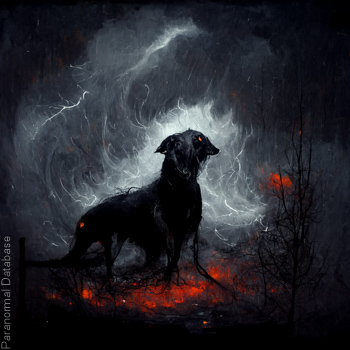 Further Comments: This hound, believed by some to be the Devil, appeared during one annual festival. The terrified attendees fled the scene, and the party was never held again.